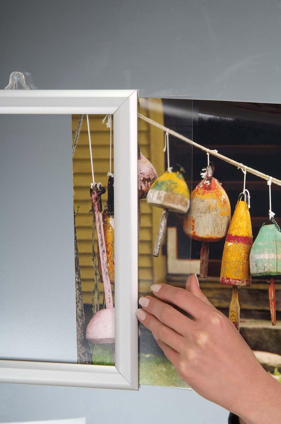 Rama jest wyposażona w plastikowe haki, które umożliwiają zawieszenie jej na ścianie, suficie lub innym miejscu ekspozycji. Dzięki temu może być stosowana w różnych aranżacjach wnętrz, w zależności od potrzeb użytkownika. Haki te montuje się na górnej krawędzi ramy, co zapewnia łatwy dostęp i stabilne zawieszenie.