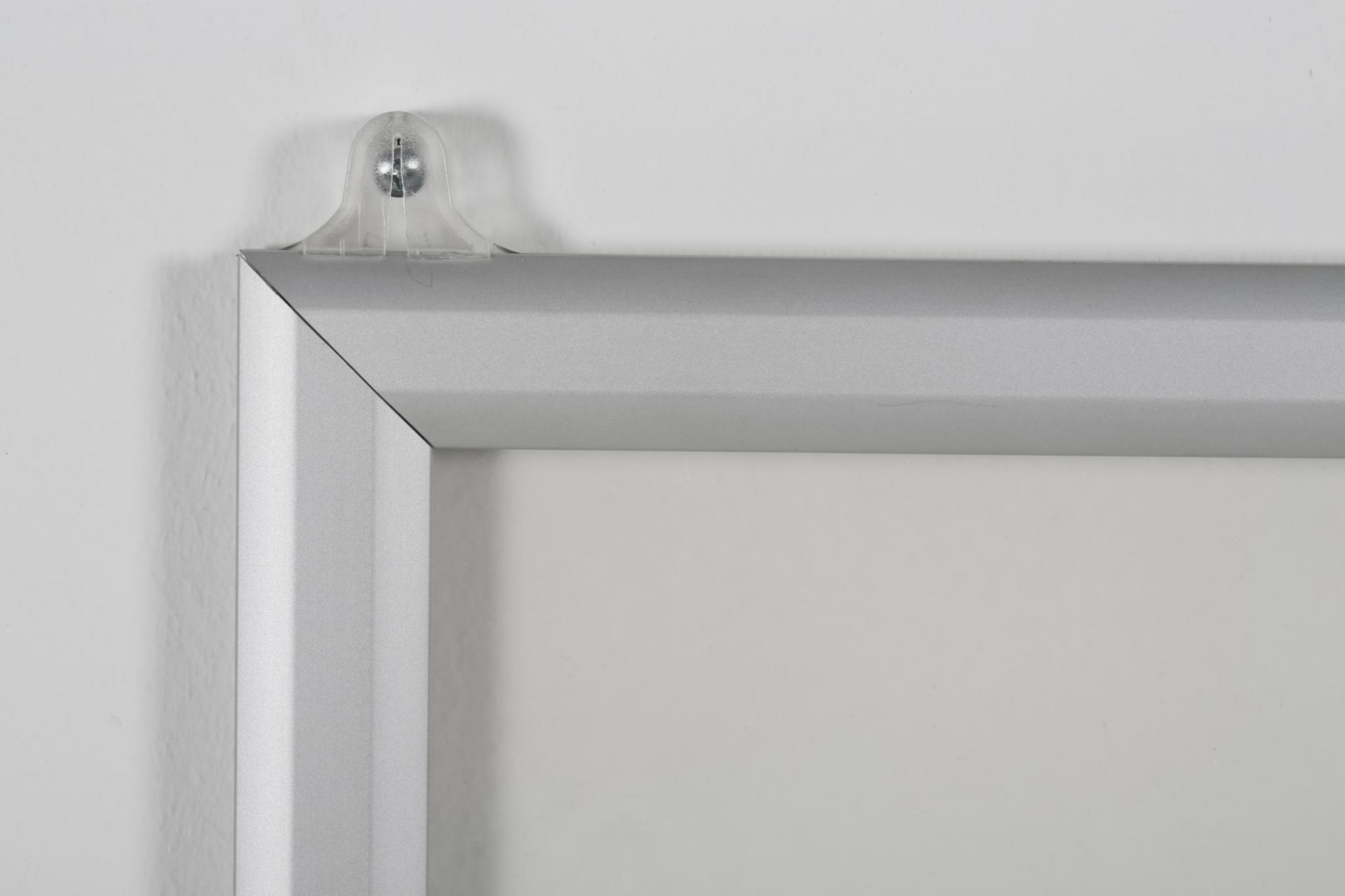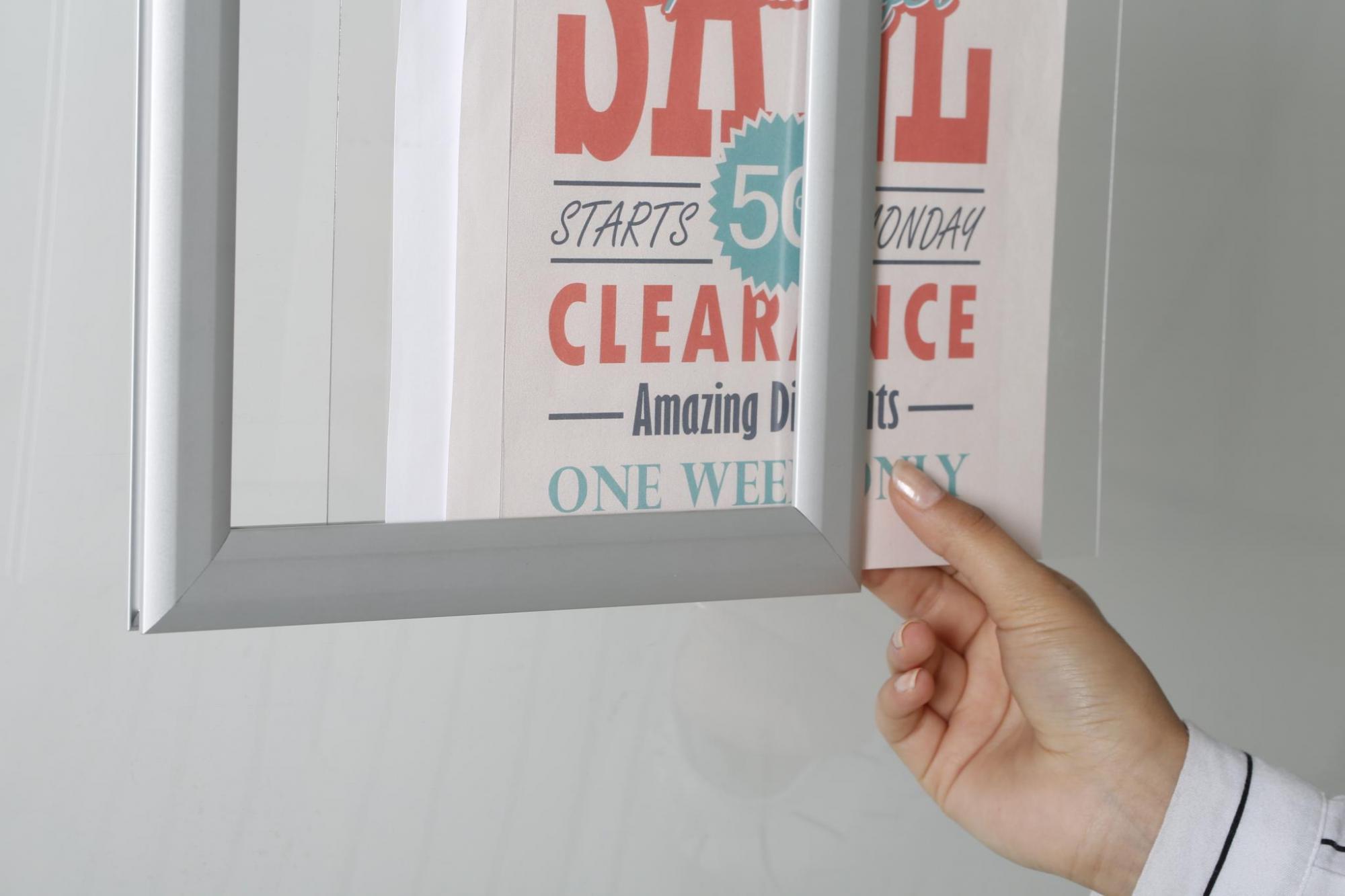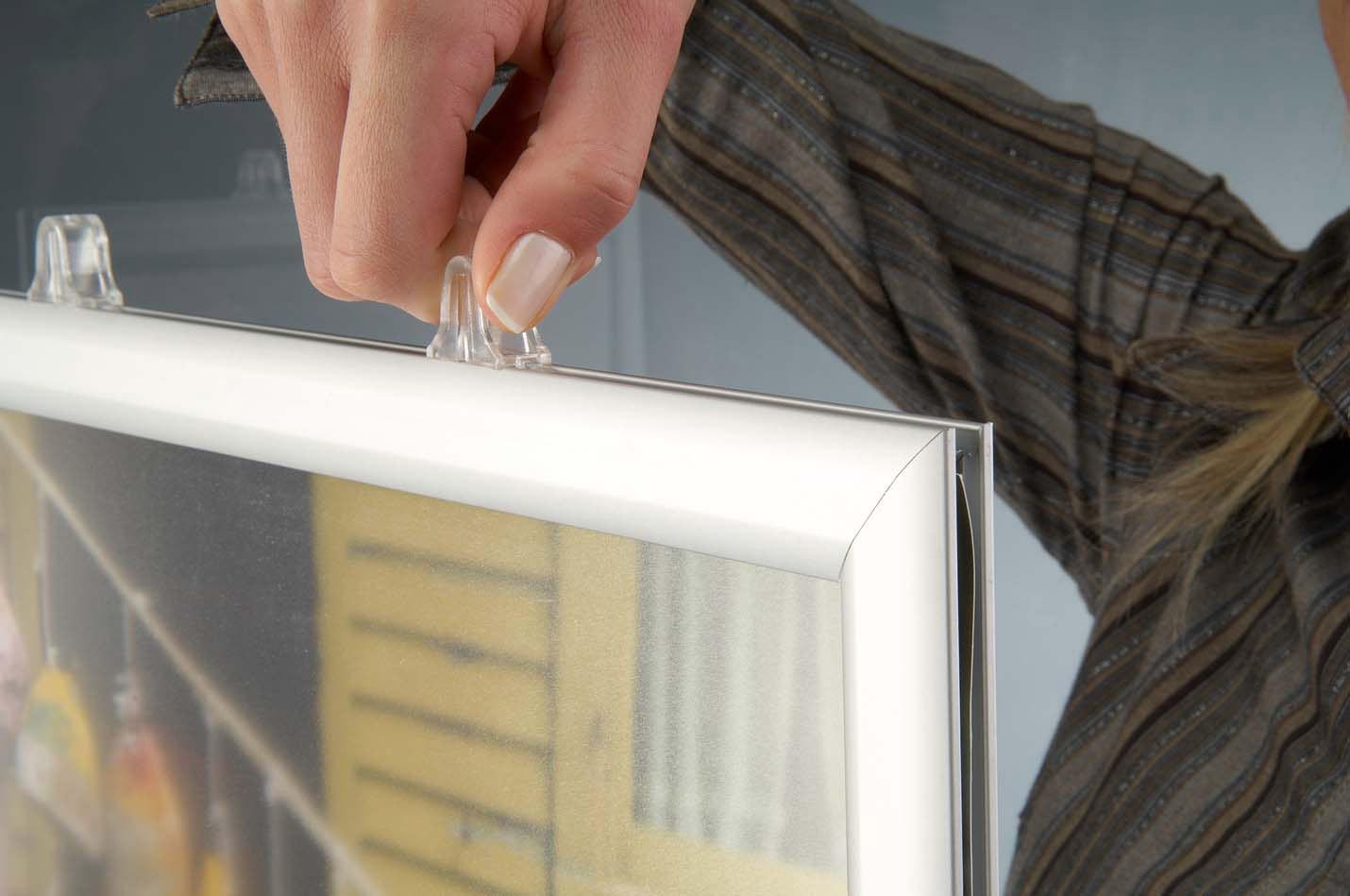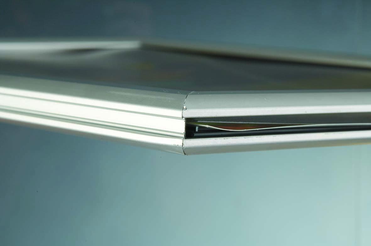 Dzięki profilowi aluminiowemu o grubości 25 mm, rama jest lekka, a jednocześnie solidna. Konstrukcja umożliwia wsuwanie plakatu z jednej strony, co sprawia, że jego wymiana jest szybka i wygodna – wystarczy wysunąć boczny panel, umieścić nowy plakat i wsunąć go z powrotem na miejsce.