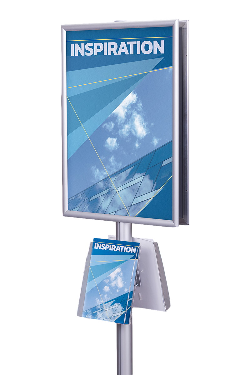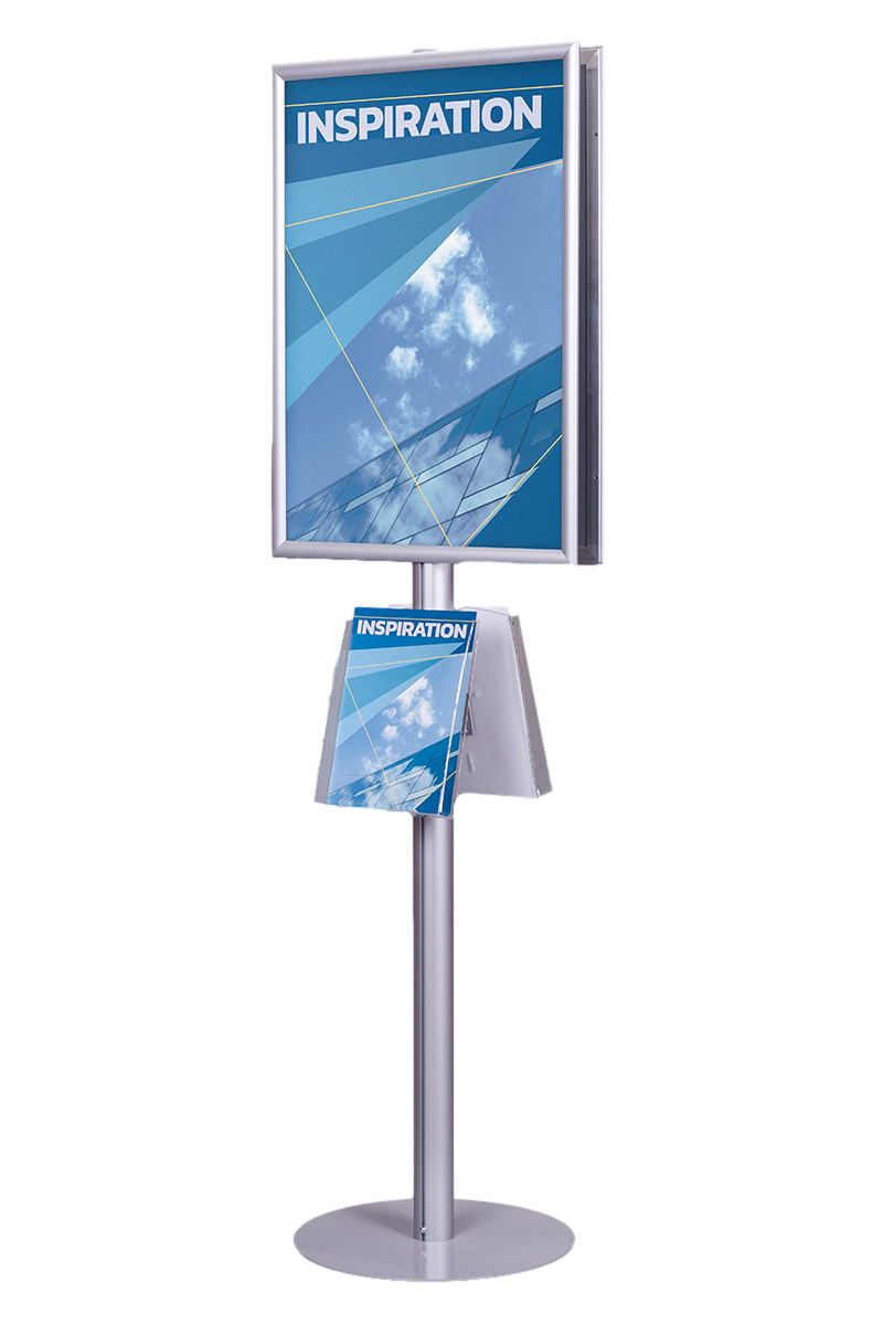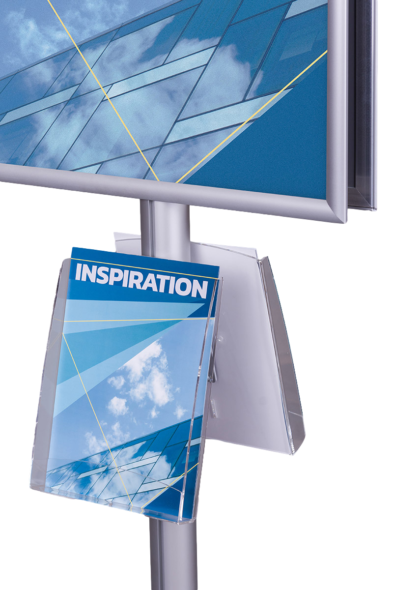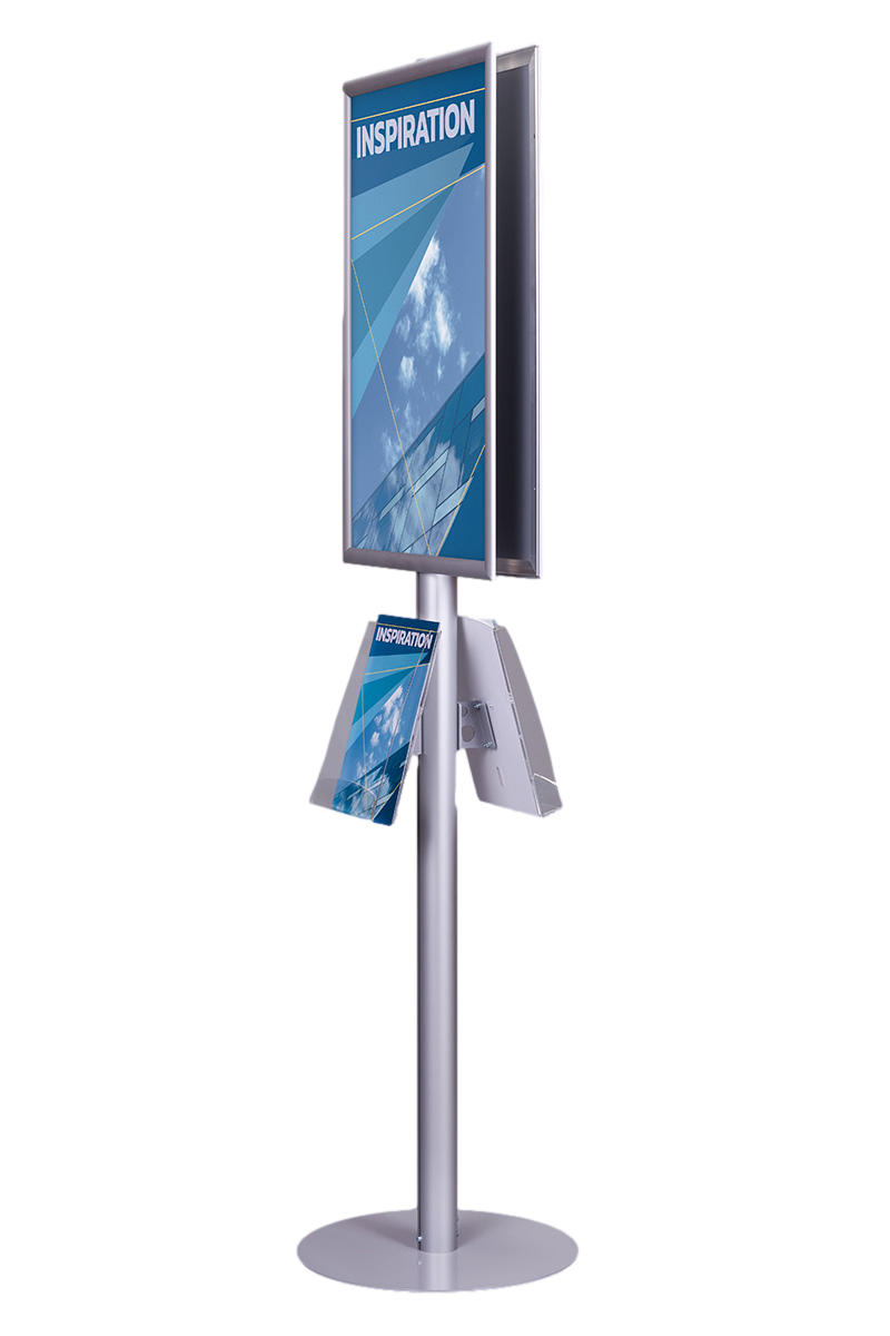 Wykonany z anodowanego aluminium, stojak zapewnia nie tylko elegancki wygląd, ale i trwałość. Jego metalowa podstawa, lakierowana proszkowo, gwarantuje stabilność i odporność na uszkodzenia mechaniczne. Na górze stojaka znajdują się dwie ramy zatrzaskowe o profilu 25 mm z prostymi narożnikami, które umożliwiają łatwą wymianę plakatów w formatach A4, A3, A2, A1, B2 oraz B1. Zabezpieczone folią antyrefleksyjną plakaty są odporne na odblaski, co zapewnia doskonałą czytelność treści w każdych warunkach oświetleniowych.