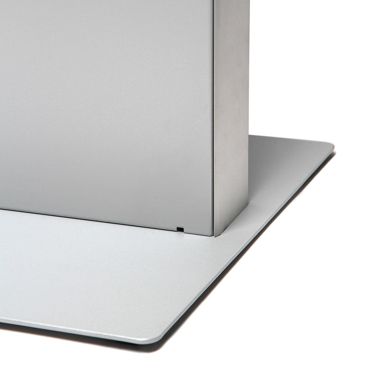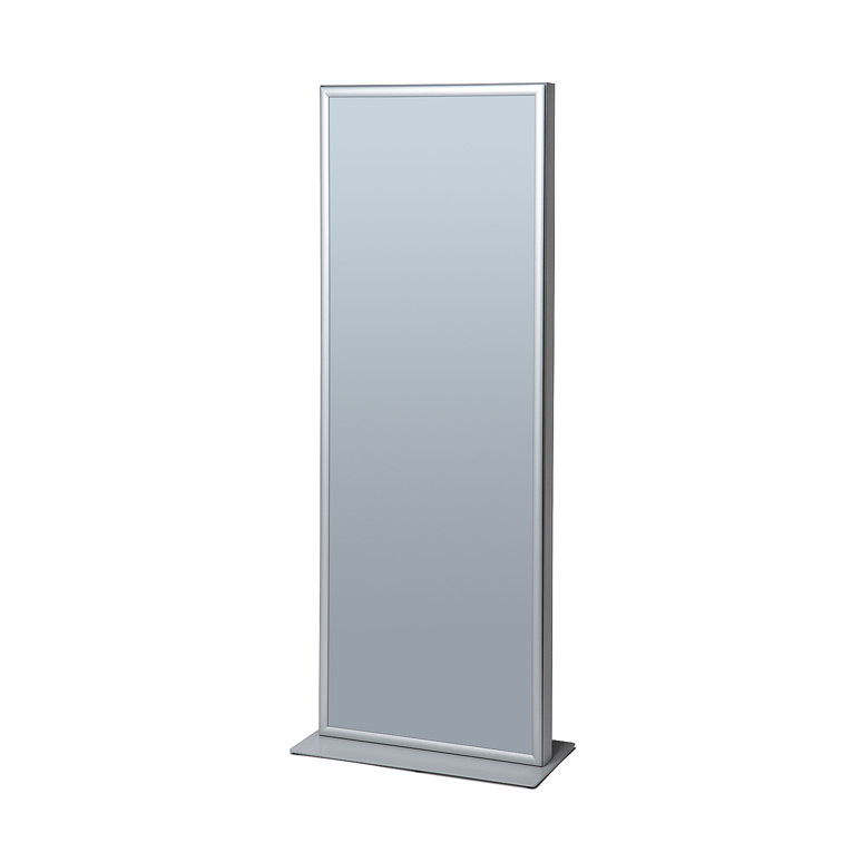 Totem został wykonany z aluminiowych profili w kolorze srebrnym, które nadają mu nowoczesny wygląd i doskonale komponują się z innymi elementami wyposażenia wnętrz. Konstrukcja jest lekka, ale jednocześnie stabilna i wytrzymała. Proste narożniki dodają całości elegancji i minimalistycznego charakteru.