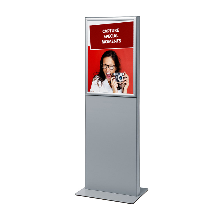 Dwustronny totem z ramami zatrzaskowymi to nowoczesne rozwiązanie do prezentacji plakatów i reklam, które przyciąga uwagę dzięki eleganckiemu i smukłemu designowi.