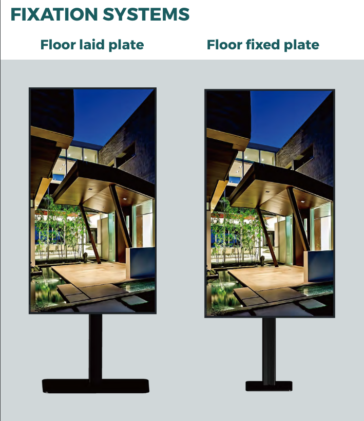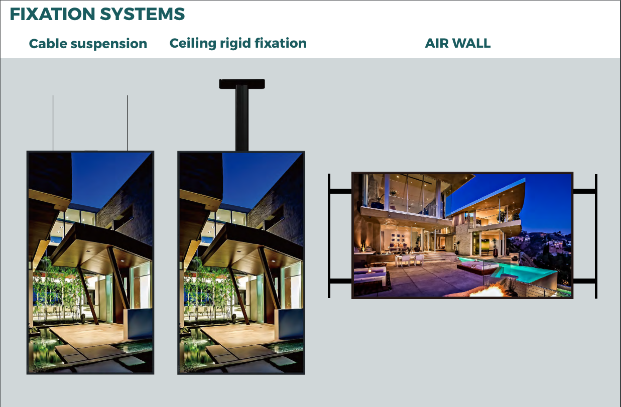 Eco Smart Display jest kompatybilny z całą gamą systemów montażowych, osłon tylnych i akcesoriów do zawieszania firmy VITRINEMEDIA. Można go zamocować w oknie za pomocą systemu linkowego, uchwytu ściennego Air Wall lub sztywnego uchwytu sufitowego. Eco Smart Display może być też zamocowany ma stendach podłogowych.