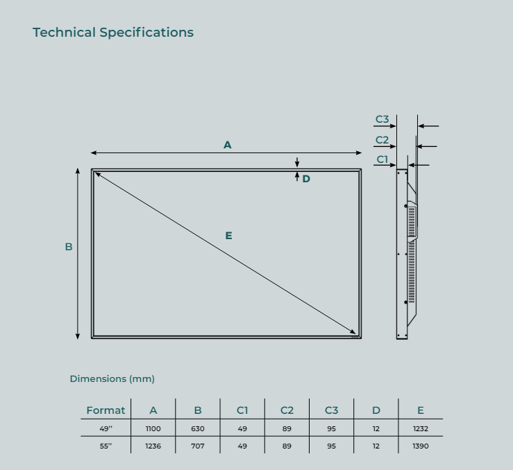 • Rozmiar: 123,6 x 70,7 x 9,5 cm (55 cali) / 110 x 63 x 9,5 cm (49 cali) dł. x szer. x gł.