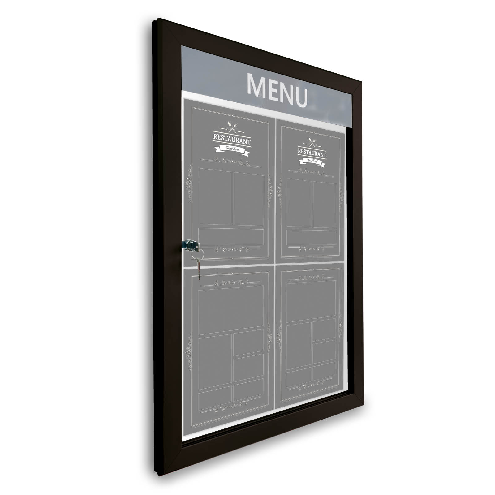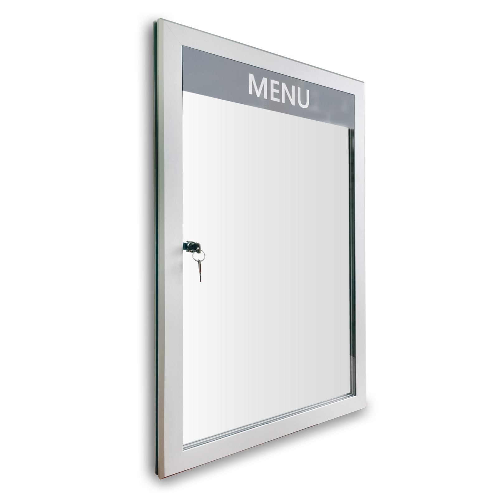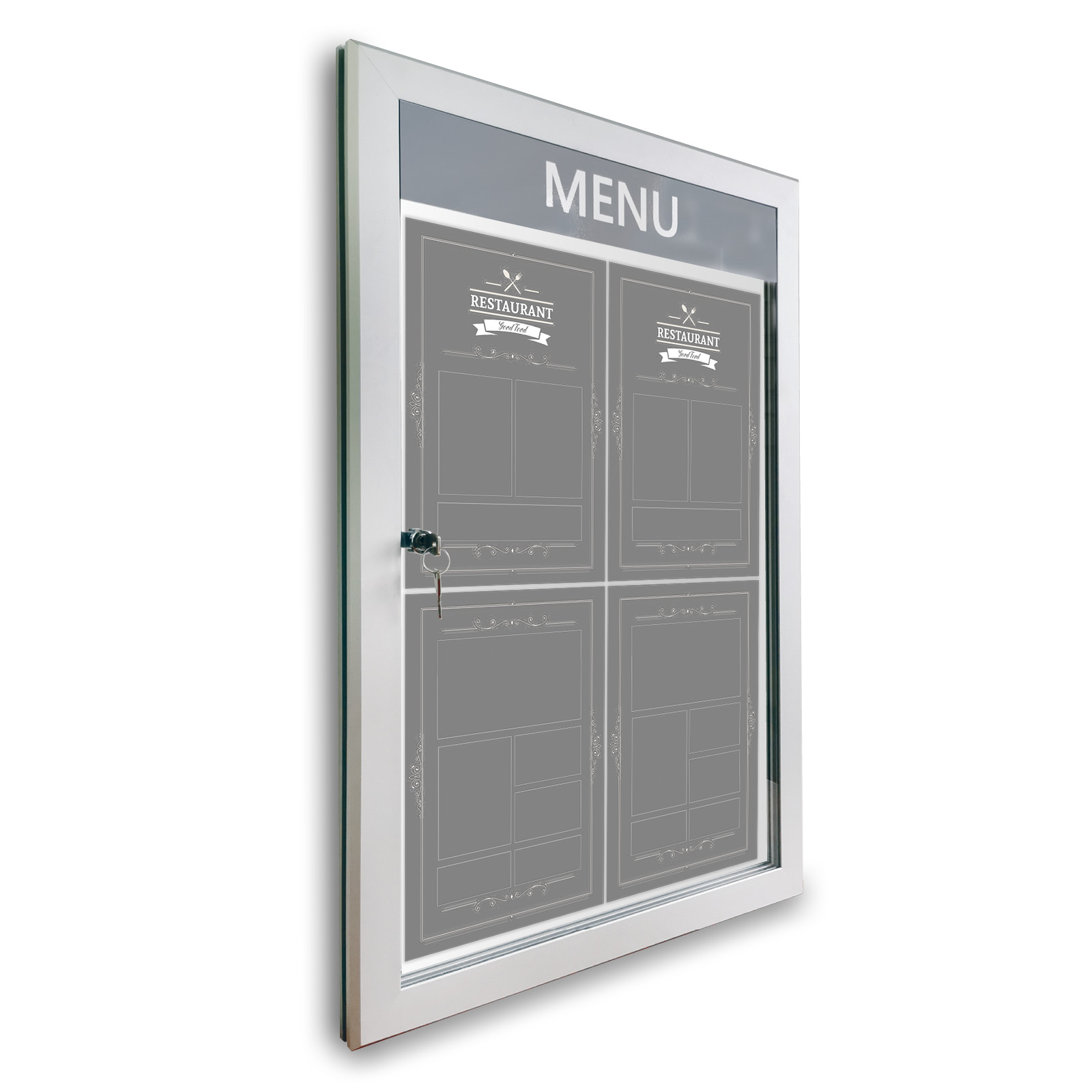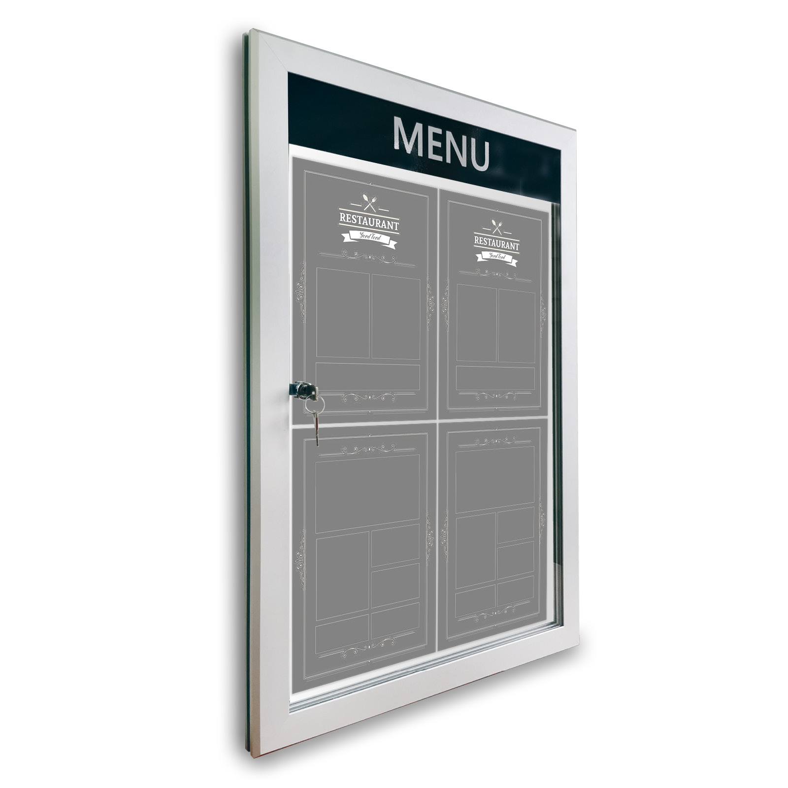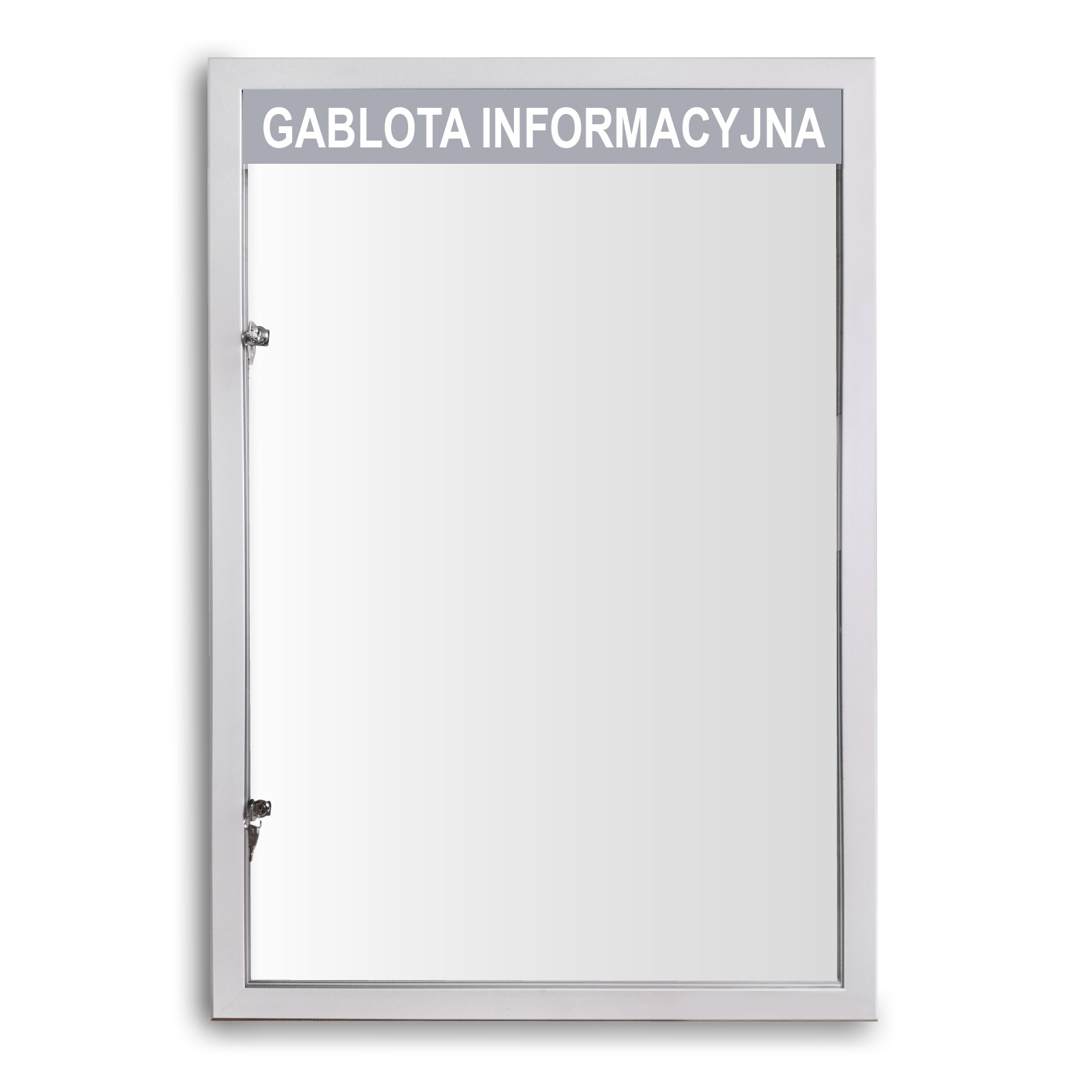 Pasek informacyjny na górnej części szyby pozwala na umieszczenie dodatkowych informacji w estetyczny sposób. Wysokość paska zależy od formatu gabloty: dla gablot mieszczących 2 i 4 arkusze A4 wynosi 80 mm, a dla większych (6, 9, 12, 15 arkuszy A4) – 100 mm. Wielkość liter na naklejce to odpowiednio 40 mm i 70 mm.