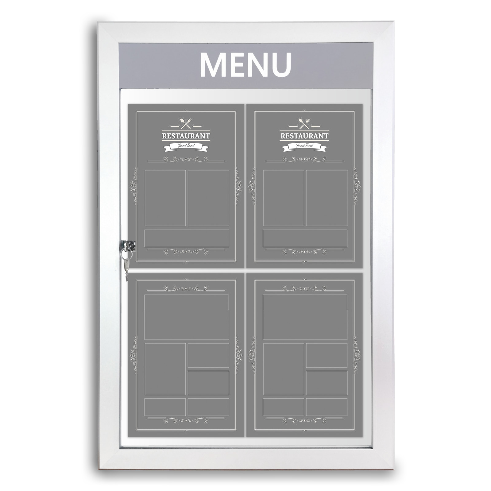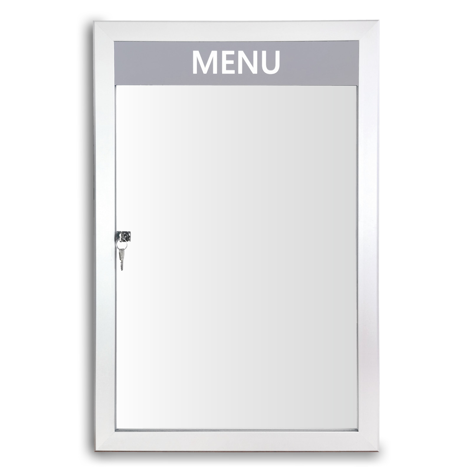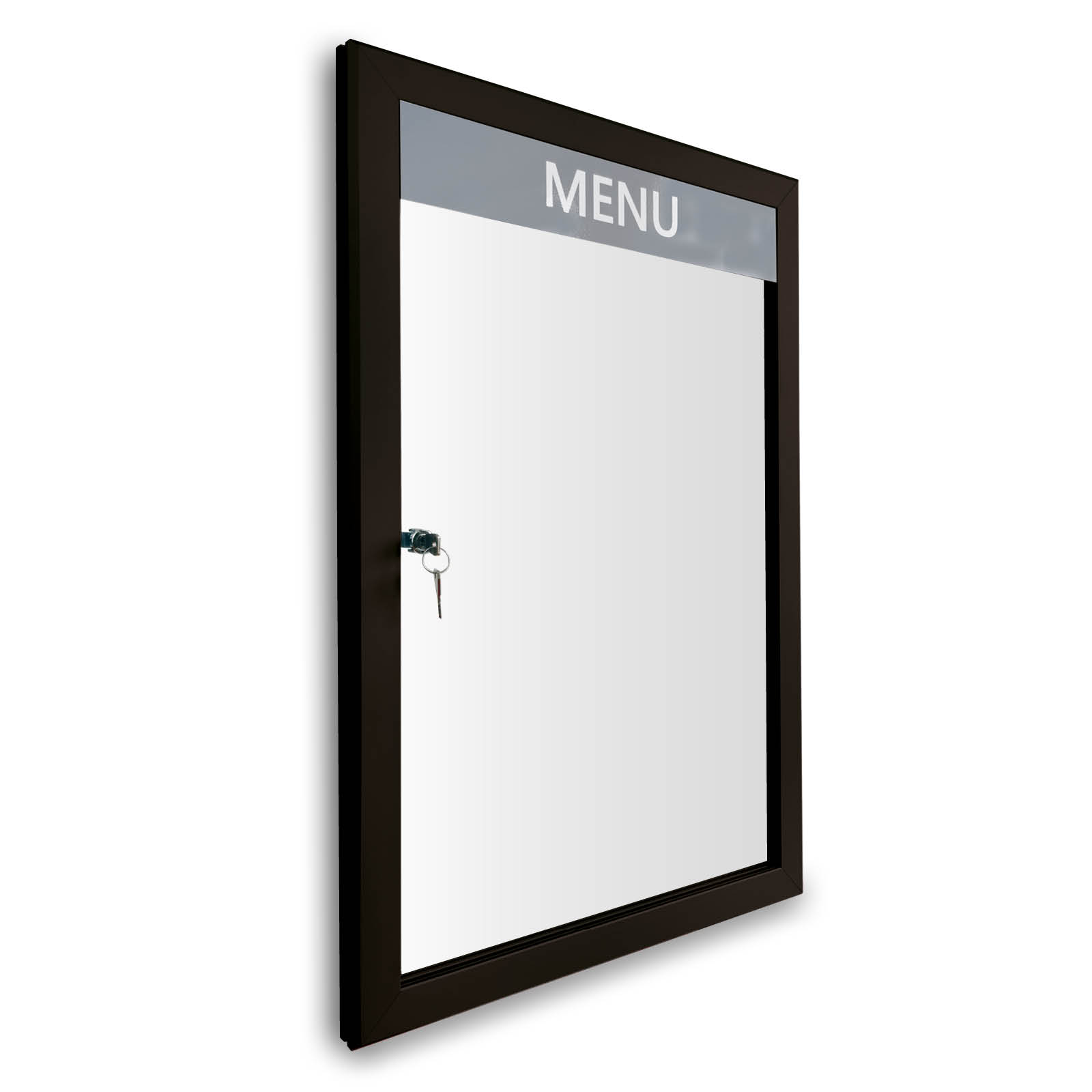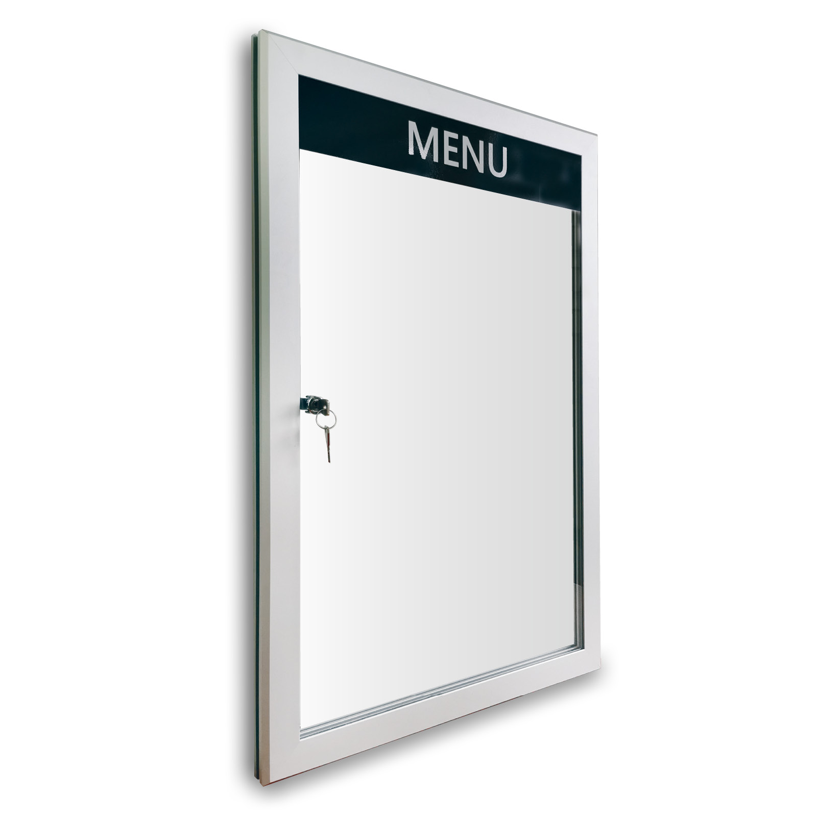 Pasek informacyjny na górnej części szyby pozwala na umieszczenie dodatkowych informacji w estetyczny sposób. Wysokość paska zależy od formatu gabloty: dla gablot mieszczących 2 i 4 arkusze A4 wynosi 80 mm, a dla większych (6, 9, 12, 15 arkuszy A4) – 100 mm. Wielkość liter na naklejce to odpowiednio 40 mm i 70 mm.