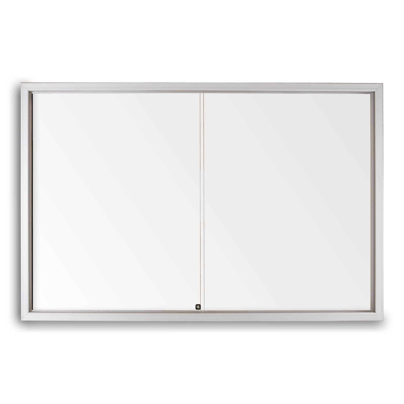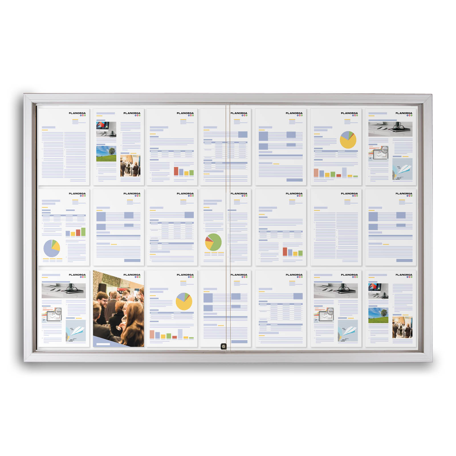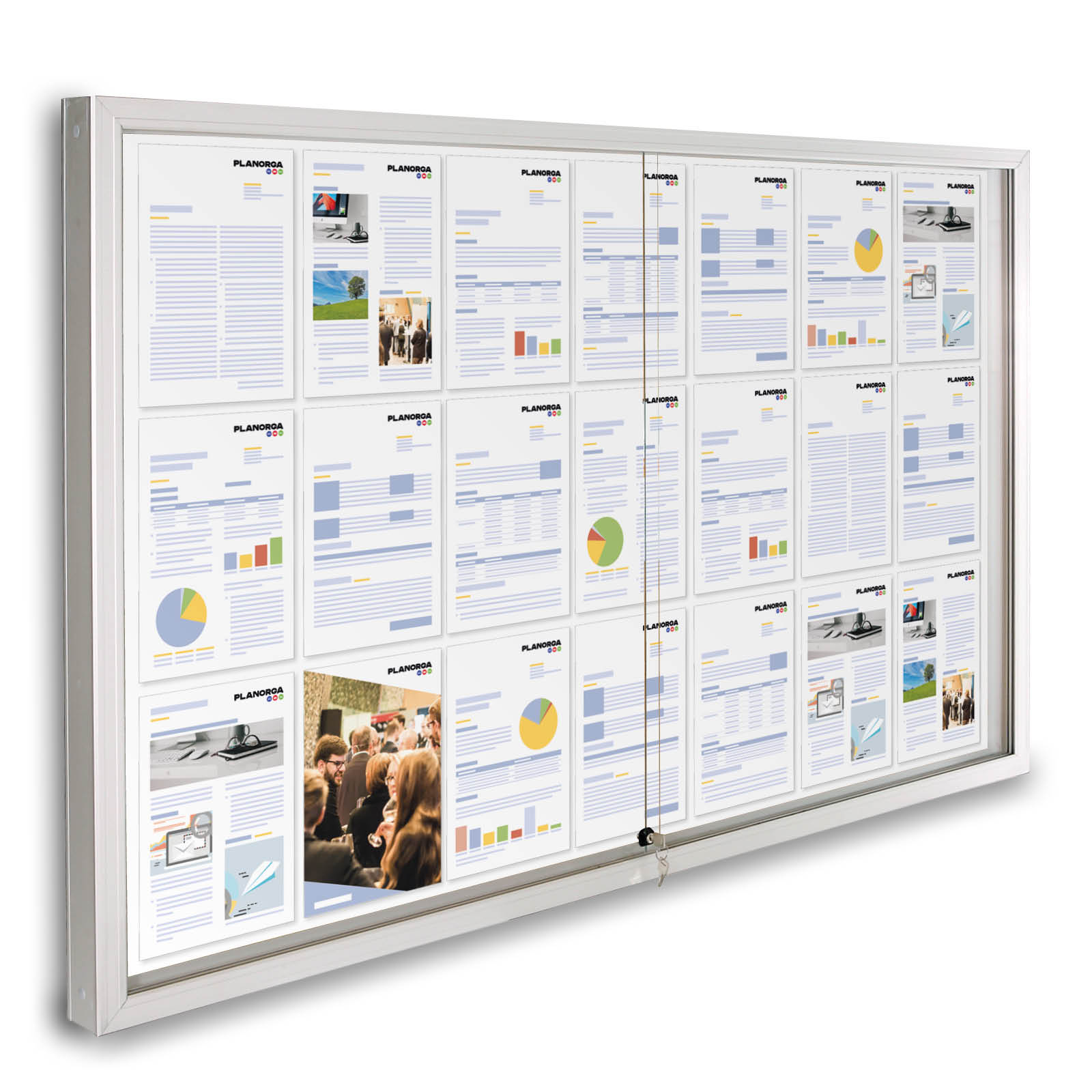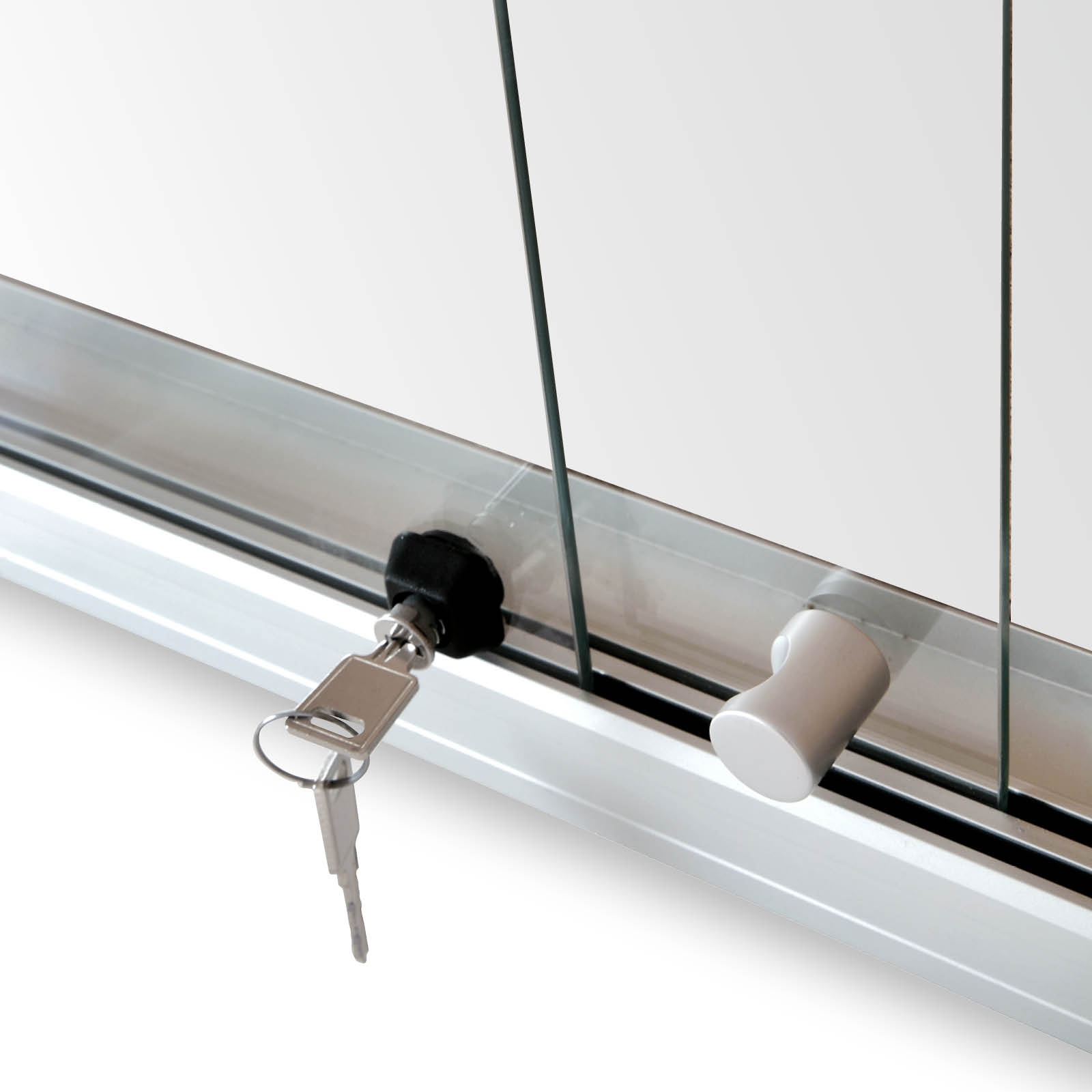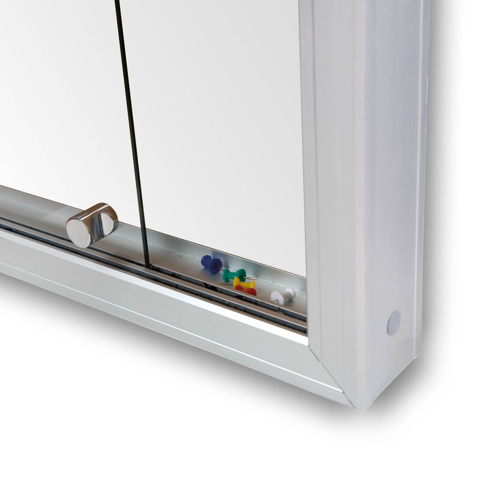 Przesuwane drzwi pozwalają na wygodne otwieranie i zamykanie gabloty bez potrzeby całkowitego usuwania drzwi, co ułatwia dostęp do dokumentów. Dodatkowo, zamek umieszczony w szybie drzwi zapewnia bezpieczeństwo i ochronę przechowywanych informacji.