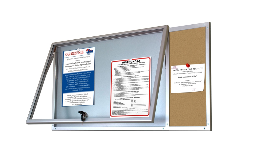 Oferujemy produkty funkcjonalne, spełniające wysokie standardowy jakości, a do tego solidne. Dostępne w naszym asortymencie gablotki da się zawiesić w poziomie i pionie. Przy zamówieniu egzemplarza jednodrzwiowego można wybrać kierunek otwierania i bok, na którym mają zostać zamontowane zawiasy. Niektóre modele mają specjalne podpórki podtrzymujące klapę, a większe są wyposażone siłowniki pneumatyczne do otwierania drzwiczek, co sprawia, że wymiana zgromadzonych w nich informacji staje się jeszcze łatwiejsza.
