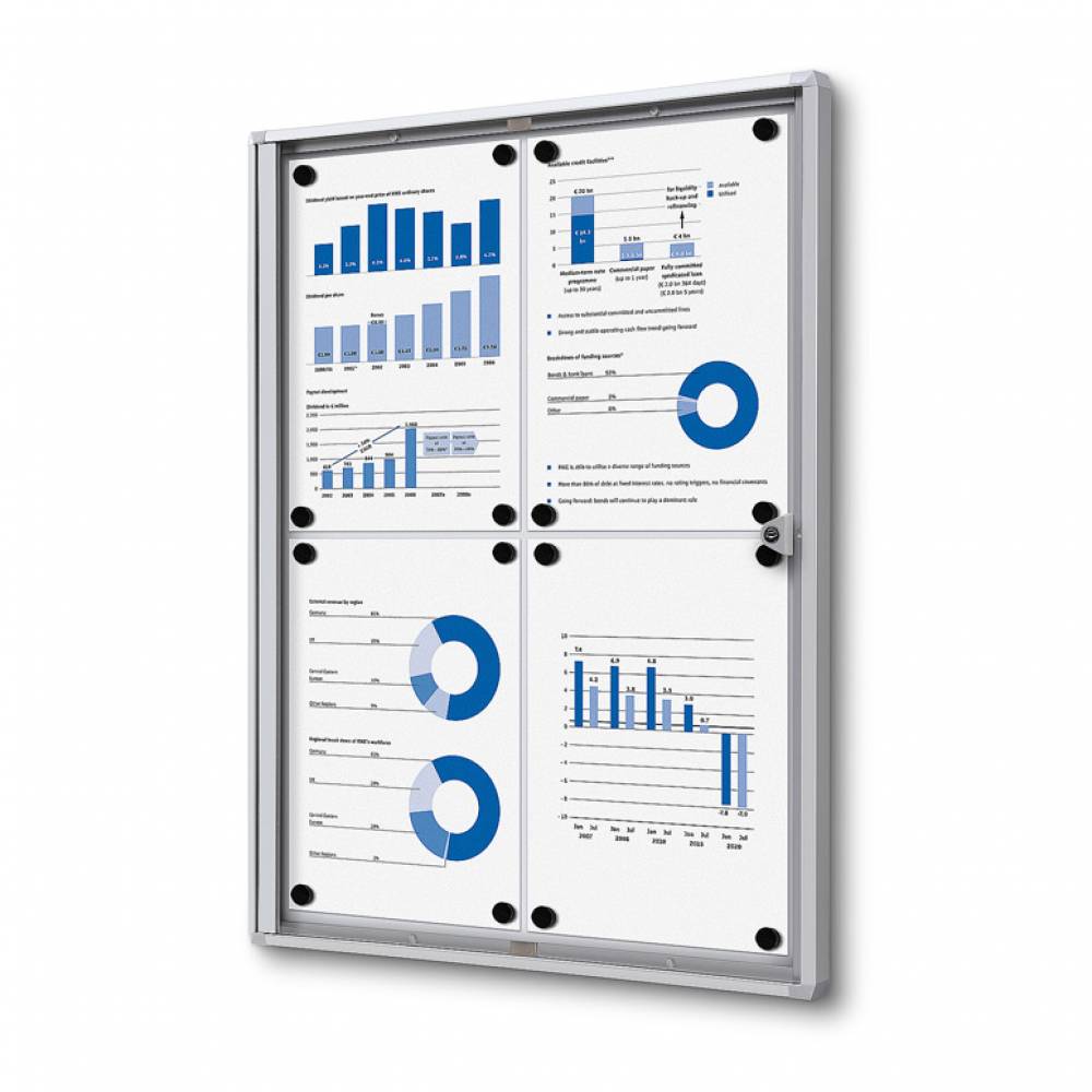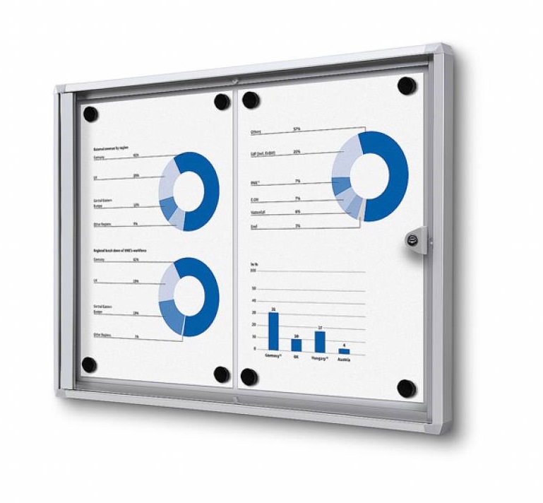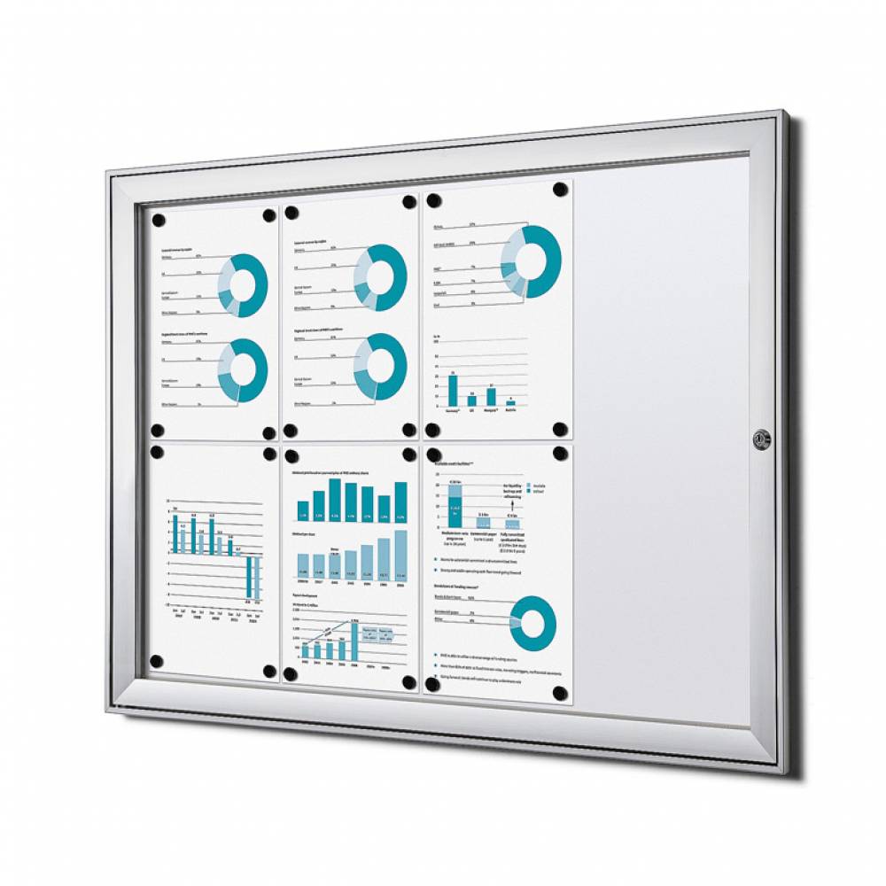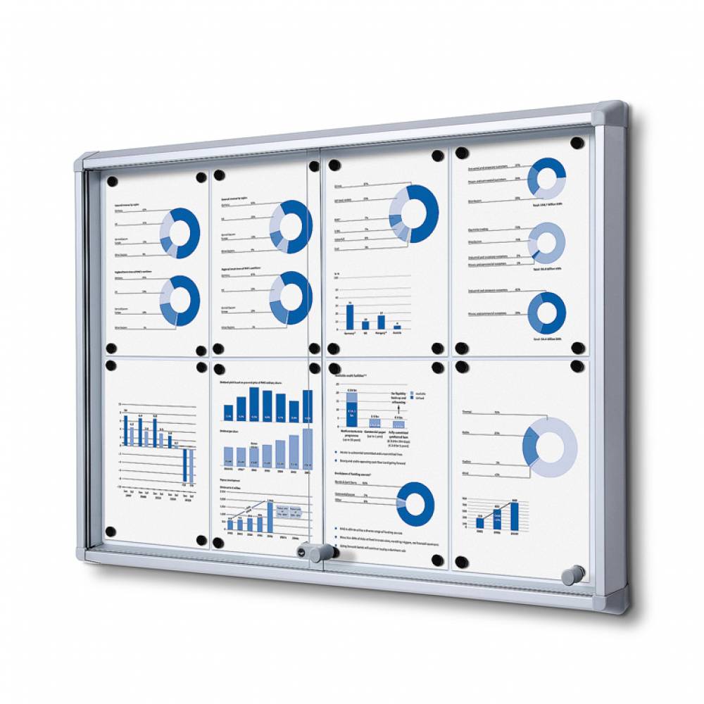 Magnetyczna gablotaogłoszeniowa wewnętrzna to ciekawa alternatywa dla klasycznych tablic korkowych. Zgromadzone poniżej modele ścienne zostały wyposażone w pomalowany na uniwersalny biały kolor tylny panel, na którym zamieszcza się materiały informacyjne za pomocą magnesów. To rozwiązanie cieszy się ogromną popularnością, ponieważ pozwala na szybką wymianę prezentowanych informacji bez konieczności przebijania wydruków czy grafik, dzięki czemu można używać ich wiele razy w różnych miejscach. Magnetyczna ogłoszeniowa gablota wewnętrzna do powieszenia na ścianie daje także inne interesujące możliwości - umożliwia zapisywanie informacji za pomocą markerów przeznaczonych do tablic suchościeralnych.