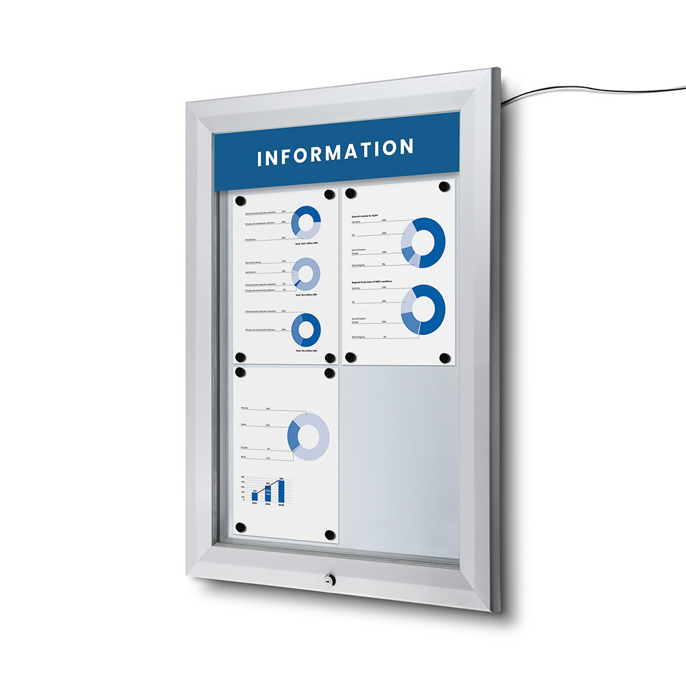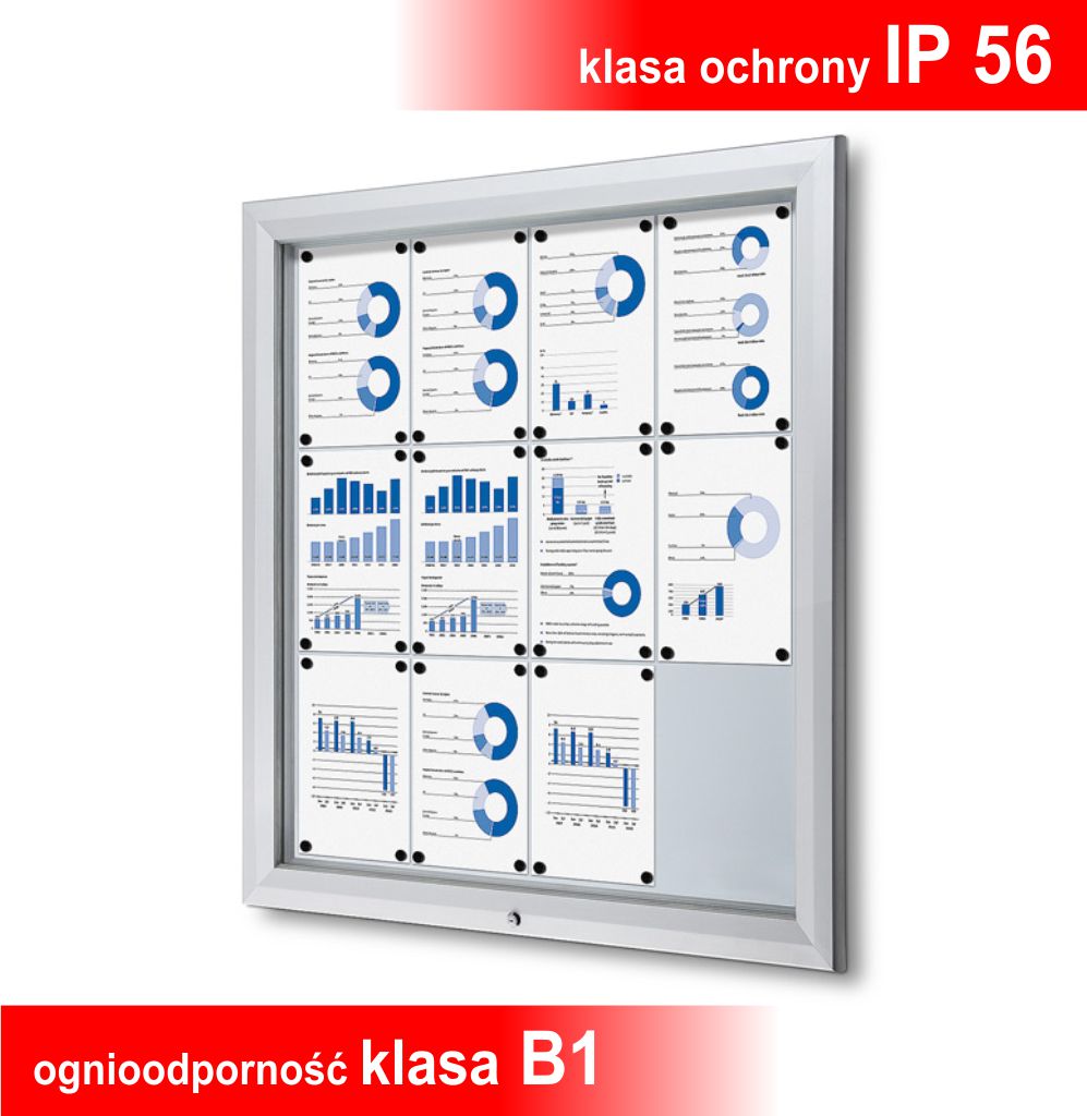 Zewnętrzne gabloty ścienne przystosowane są do powieszenia na ścianie lub ogrodzeniu. Zrobione są z bardzo wytrzymałych materiałów. Zostały zaprojektowane tak, aby wszelkiego rodzaju czynniki atmosferyczne, takie jak wilgoć, woda, słońce czy kurz, nie stanowiły zagrożenia dla prezentowanych materiałów. Panel przedni wykonany z hartowanego szkła. Drzwi zamykane na zamek. Są też odporne na warunki atmosferyczne  dzięki silikonowym uszczelkom. W ofercie posiadamy tradycyjne gabloty magnetyczne, korkowe i filcowe, jak również z podświetleniem  LED.