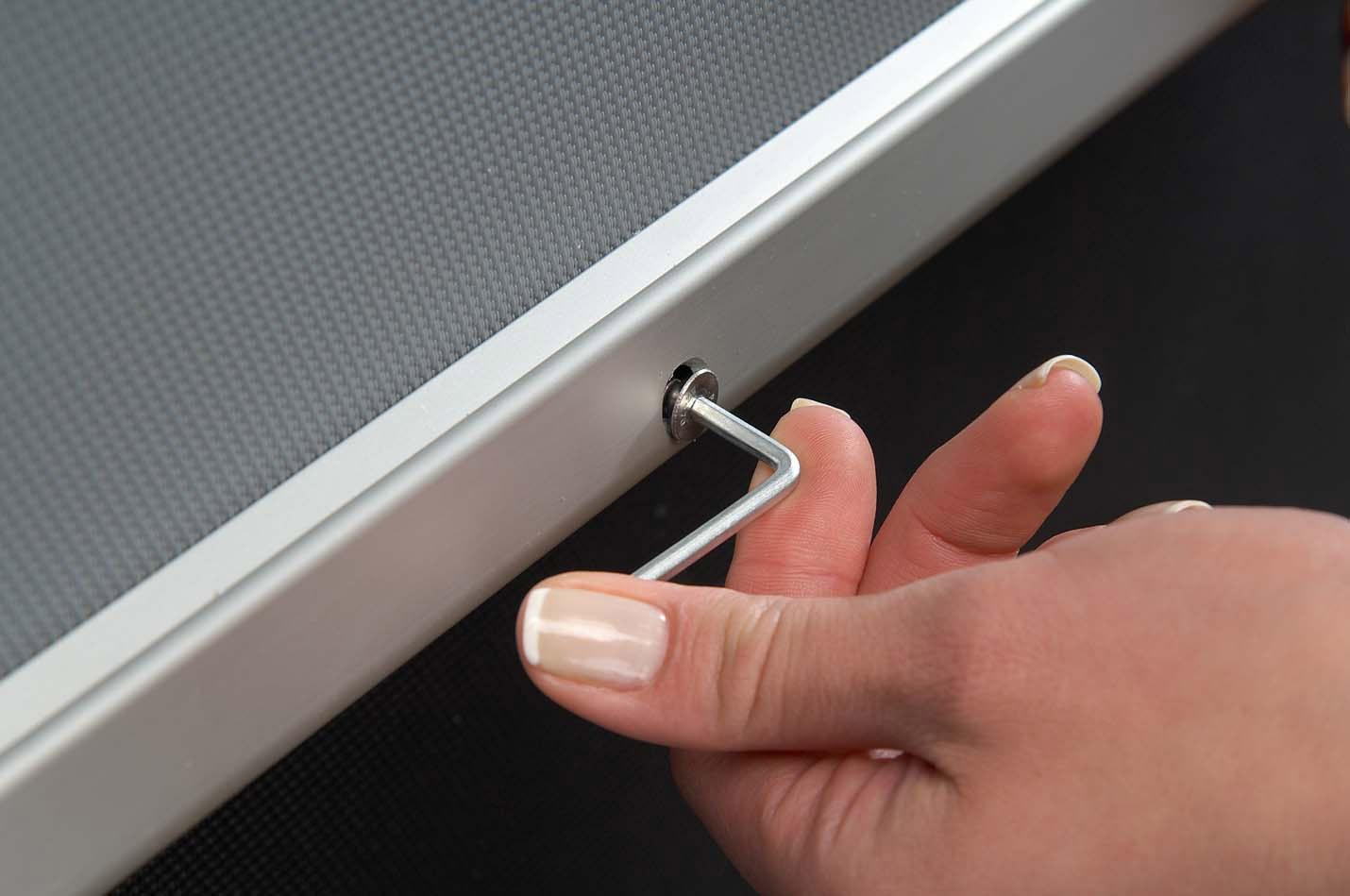 Wymiana plakatu w ramce jest szybka i łatwa – wystarczy odblokować ramę kluczem imbusowym, wymienić plakat i zamknąć ramkę. Cały proces zajmuje tylko kilka sekund.