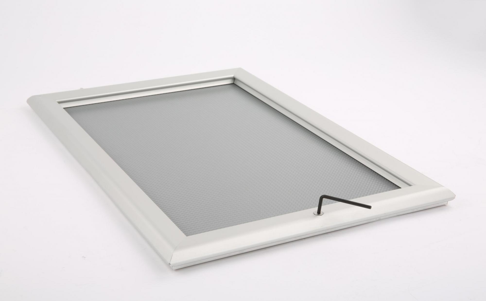 Dzięki srebrnej obudowie i prostej konstrukcji otwieranej od przodu, jest łatwa w użytkowaniu, a jednocześnie zapewnia bezpieczne przechowywanie plakatów. Rama wyposażona jest w specjalny system zamykania na klucz inbusowy, co uniemożliwia nieautoryzowane otwieranie. W zestawie znajduje się jeden klucz, który blokuje wszystkie boki ramki, gwarantując stabilność i bezpieczeństwo ekspozycji.