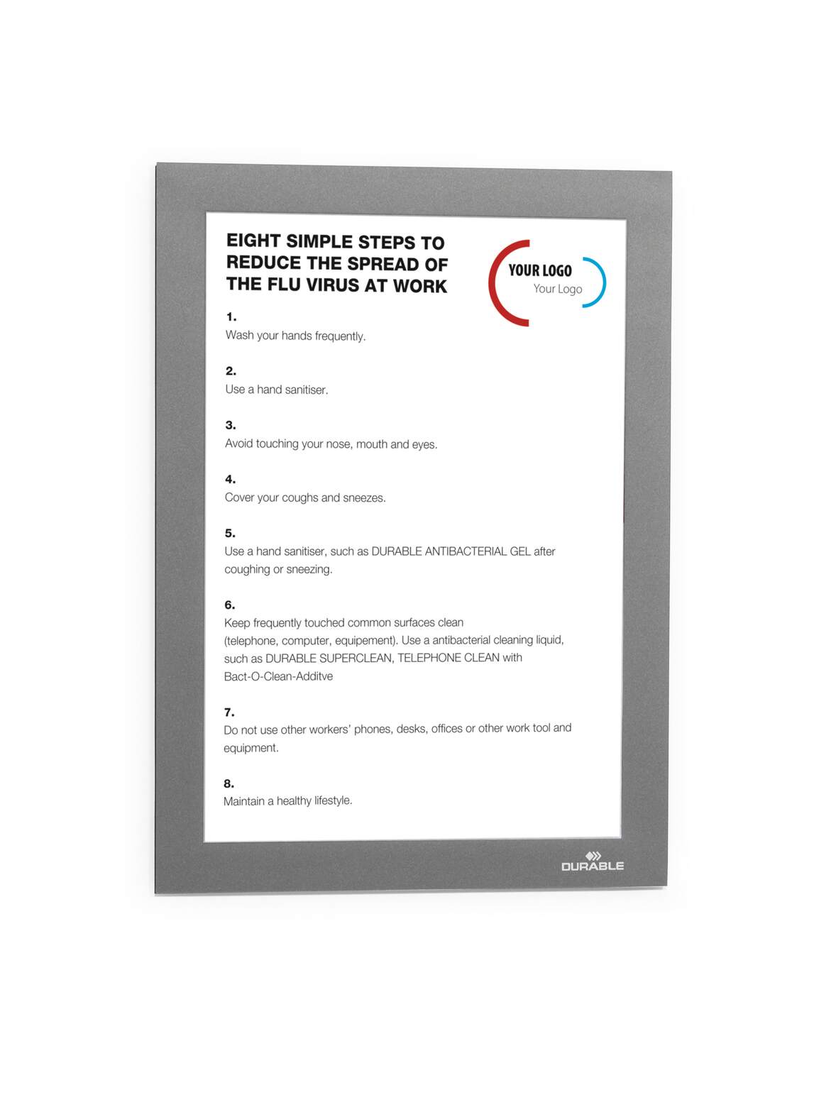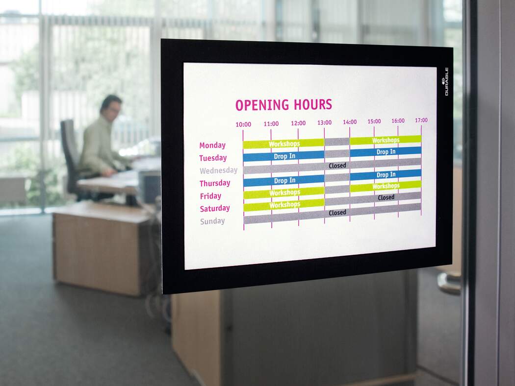 Mechanizm wymiany treści jest bardzo prosty i oparty na magnesach. Wystarczy odchylić przedni panel ramki, wymienić kartę informacyjną i zamknąć ramkę, a zawartość zostaje pewnie utrzymana dzięki magnetycznemu zapięciu. Taki system umożliwia wielokrotne i szybkie aktualizowanie treści.