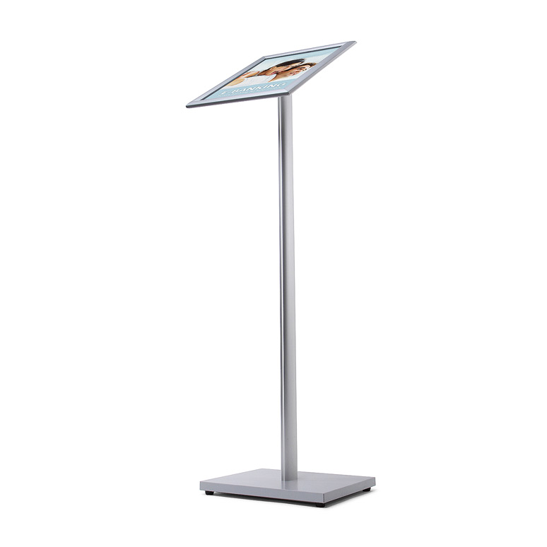 Stojak dostępny jest w formacie A3 oraz i umożliwia mocowanie zarówno w orientacji pionowej, jak i poziomej, co dodaje mu wszechstronności. Dodatkowo, proste lub zaokrąglone narożniki ramki podkreślają jego nowoczesny design, a kompaktowe wymiary (A3: 330 x 1100 x 391 mm) sprawiają, że stojak nie zajmuje dużo miejsca i łatwo go przestawić.