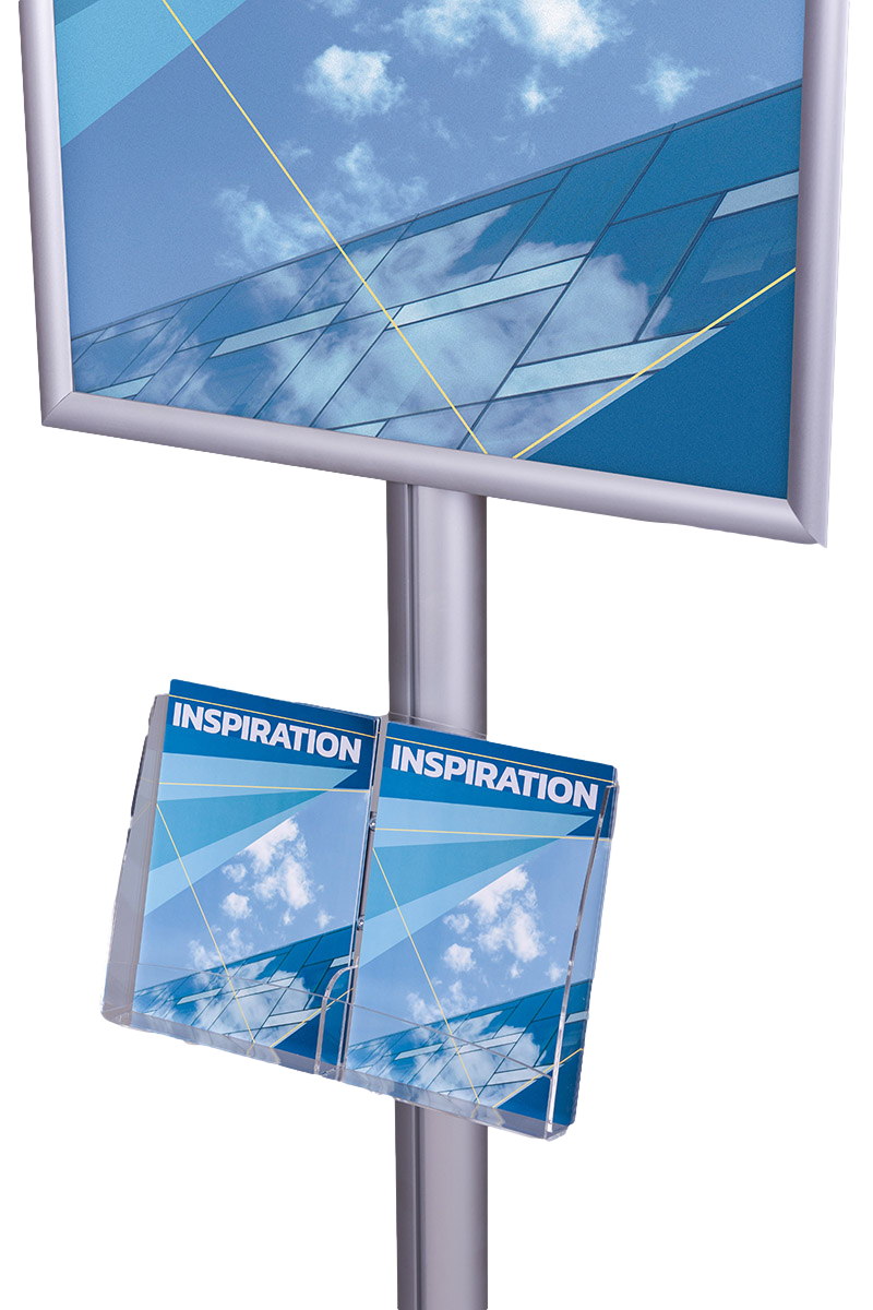 Stojak posiada kieszenie na ulotki w różnych konfiguracjach: A5, A4, 2xA5, 2xA4, 3xDL. Kieszenie są dostępne w wersjach z plexi o grubości 3 mm lub metalowe, lakierowane proszkowo.