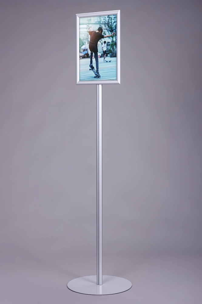 Stojak SP003 wyposażony jest w ramę zatrzaskową OWZ, która umożliwia szybką i łatwą wymianę plakatu. Dostępny w wielu formatach – od A4 po B1 – pozwala na pełną swobodę w dopasowaniu ekspozycji do indywidualnych potrzeb.