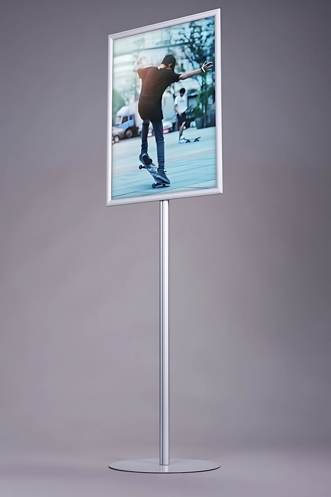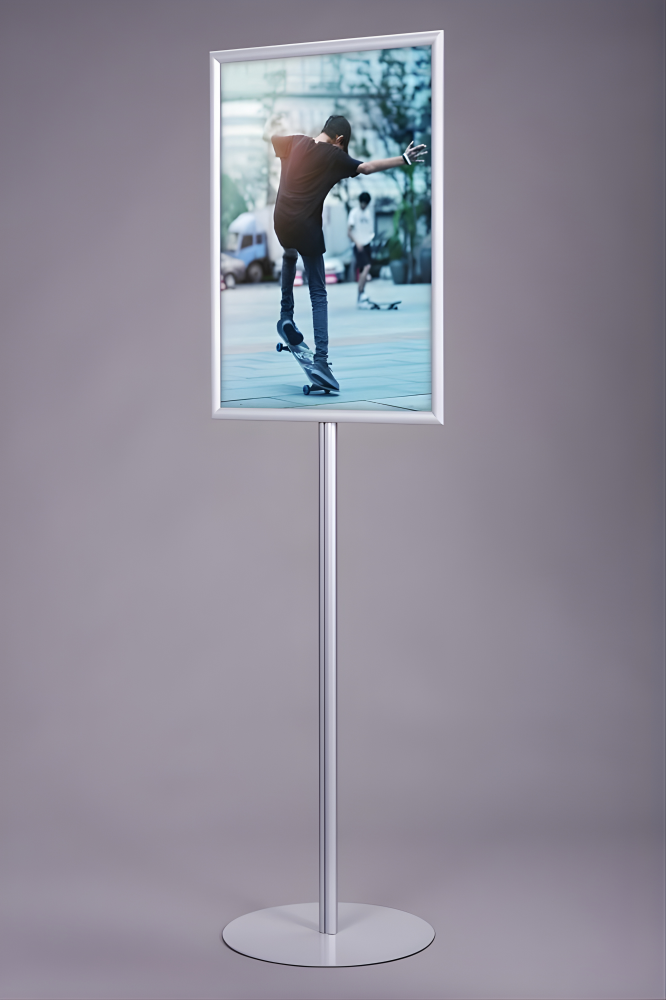 Stojak na plakat SP003 to eleganckie i funkcjonalne rozwiązanie, które doskonale sprawdzi się w prezentacji materiałów reklamowych i informacyjnych w różnorodnych przestrzeniach – od biur i firm, przez hole i recepcje, aż po targi i wystawy.