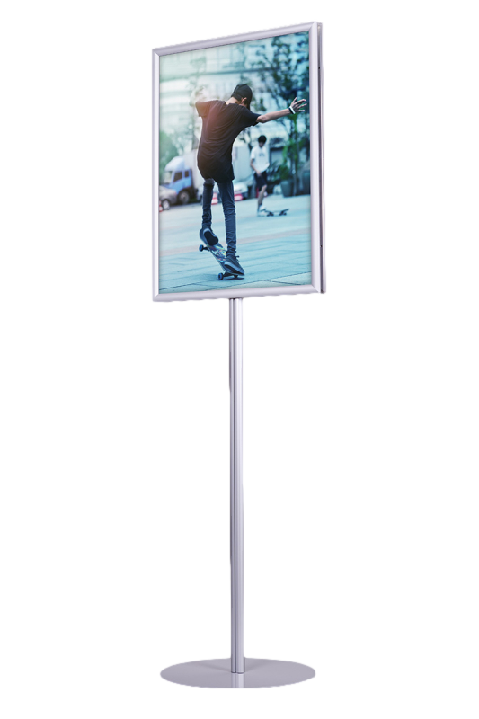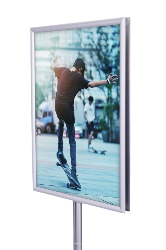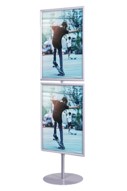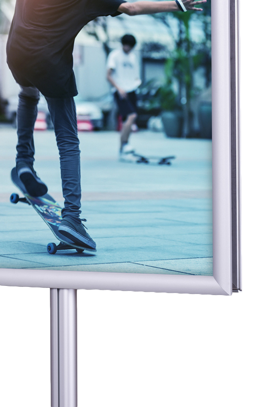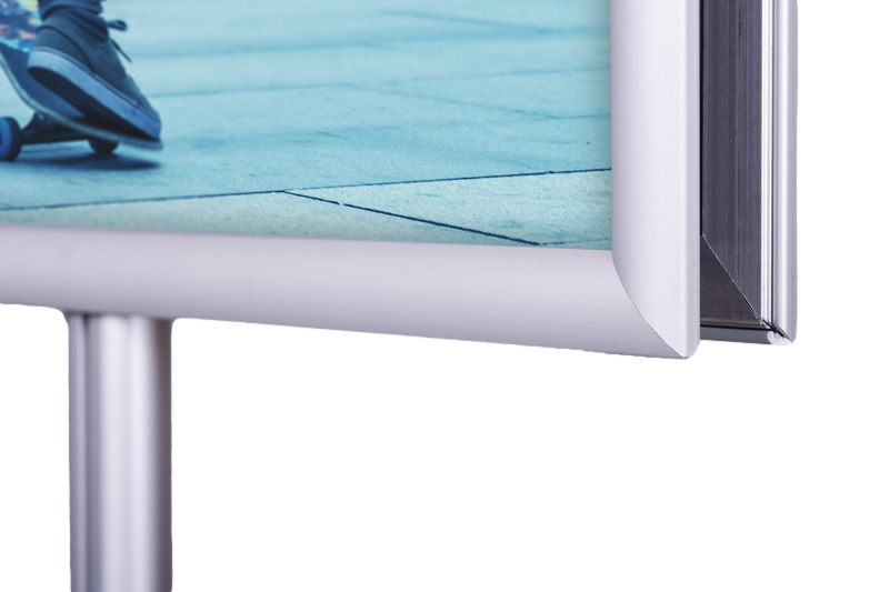 Na szczycie stojaka zamontowane są dwie ramy zatrzaskowe o profilu 25 mmz prostymi narożnikami, co nadaje mu minimalistyczny, elegancki wygląd. Dostępne formaty obejmują A4, A3, A2, A1, B2 i B1, a ramy w mniejszych formatach (A4 i A3) można ustawić zarówno w orientacji pionowej, jak i poziomej, co zwiększa wszechstronność zastosowań. Dzięki systemowi OWZ (otwórz, włóż, zamknij) wymiana plakatów jest szybka i nieskomplikowana, a specjalna folia antyrefleksyjna o grubości 0,5 mm skutecznie chroni treści przed odblaskami i uszkodzeniami.