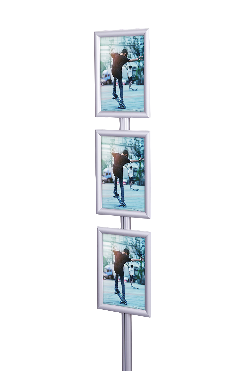 Stojak wyposażony jest w trzy ramy zatrzaskowe OWZ o profilu 25 mm, które umożliwiają łatwą i szybką wymianę plakatów. Ramy można montować w orientacji pionowej lub poziomej (format A2 tylko w poziomie), co zwiększa elastyczność w sposobie wyświetlania treści. Plakaty są chronione przez folię antyrefleksyjną o grubości 0,5 mm.