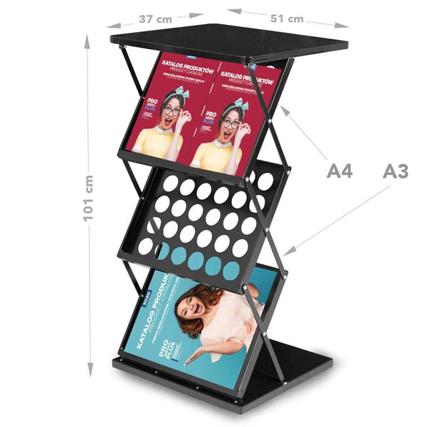 Dzięki tym dwóm opcjom, stojak może pomieścić zarówno broszury w formacie A4, jak i większe materiały w formacie A3, co czyni go bardzo wszechstronnym w przechowywaniu różnych rozmiarów materiałów reklamowych.