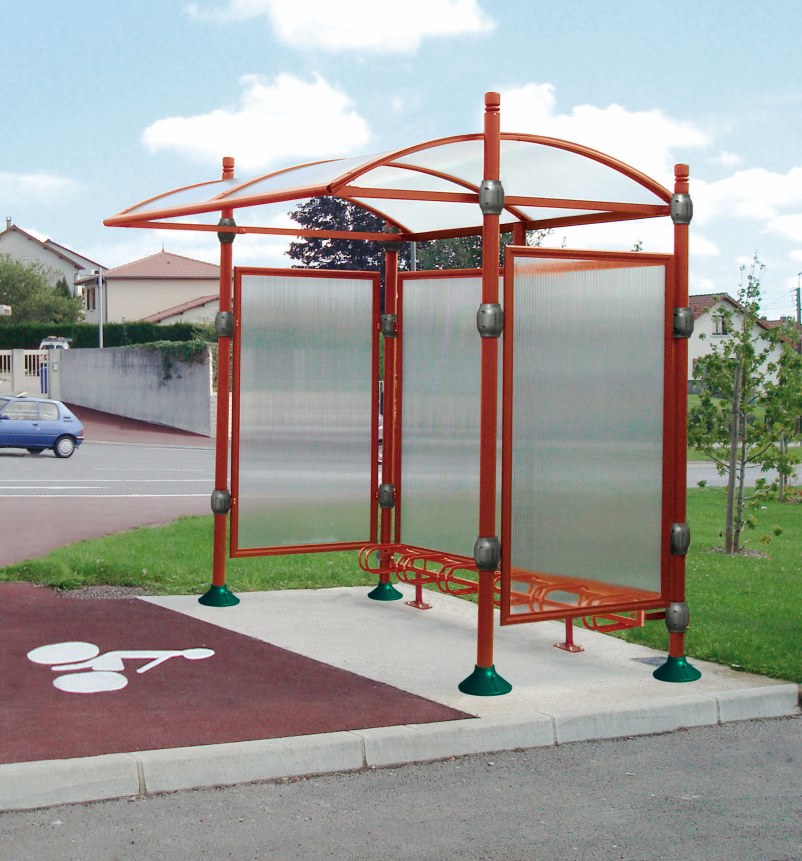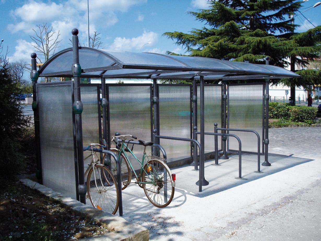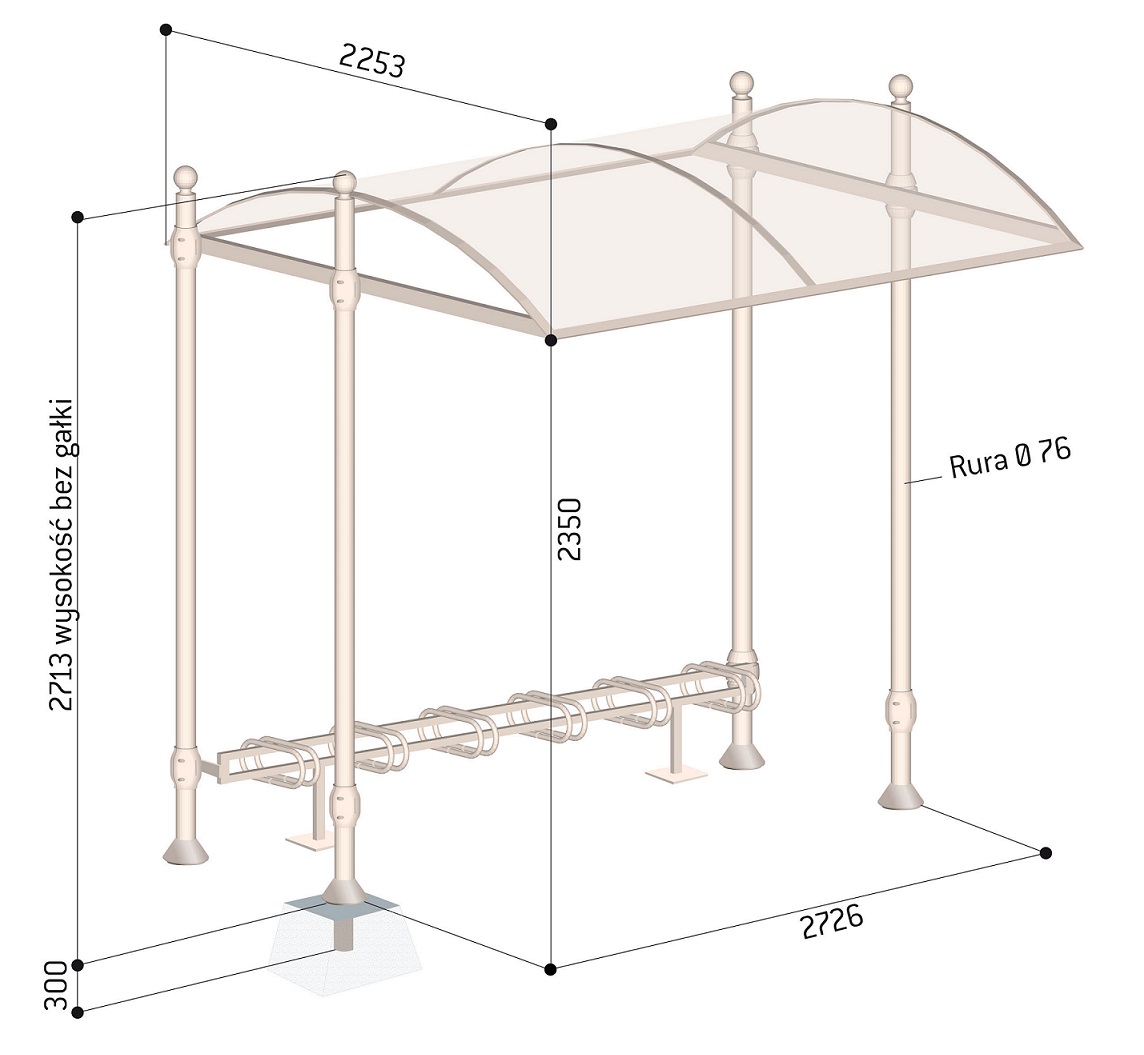 Dekoracyjna wiata na rowery wykończona ozdobnymi gałkami do wyboru: CITY, AGORA, KULA