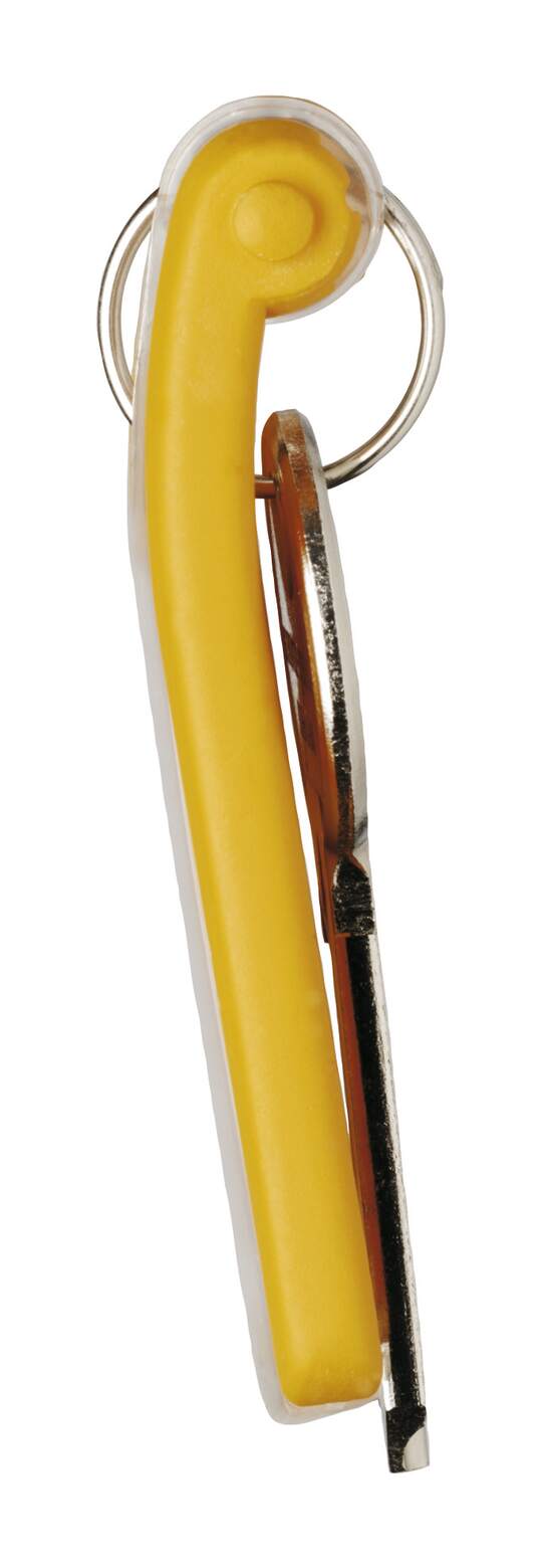 Mechanizm zaciskowy pozwala na łatwe i szybkie wysunięcie etykiety z przezroczystego okienka bez konieczności zdejmowania klucza z metalowego kółeczka, co czyni go bardzo wygodnym w obsłudze.